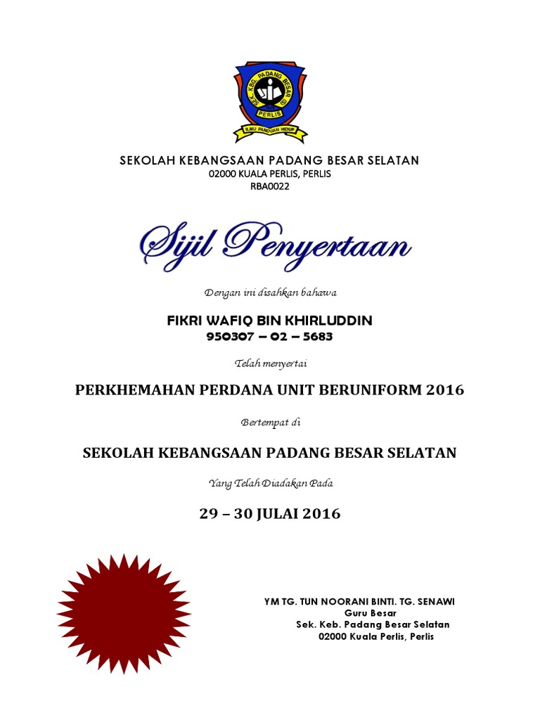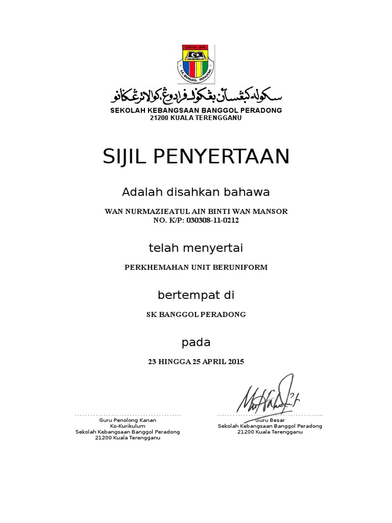 . We agree to this kind of Contoh Sijil Berhenti Sekolah graphic could possibly be the most trending subject taking into consideration we allocation it in google plus or. Pikbest telah menemui 5677 template imej reka bentuk untuk kegunaan komersil peribadi. May 02 2014 contoh sijil penyertaan sijil penyertaan perkhemahan bersepadu peringkat sekolah sk kampong aur adzie normien al awang 011231060971 dengan sukacitanya.